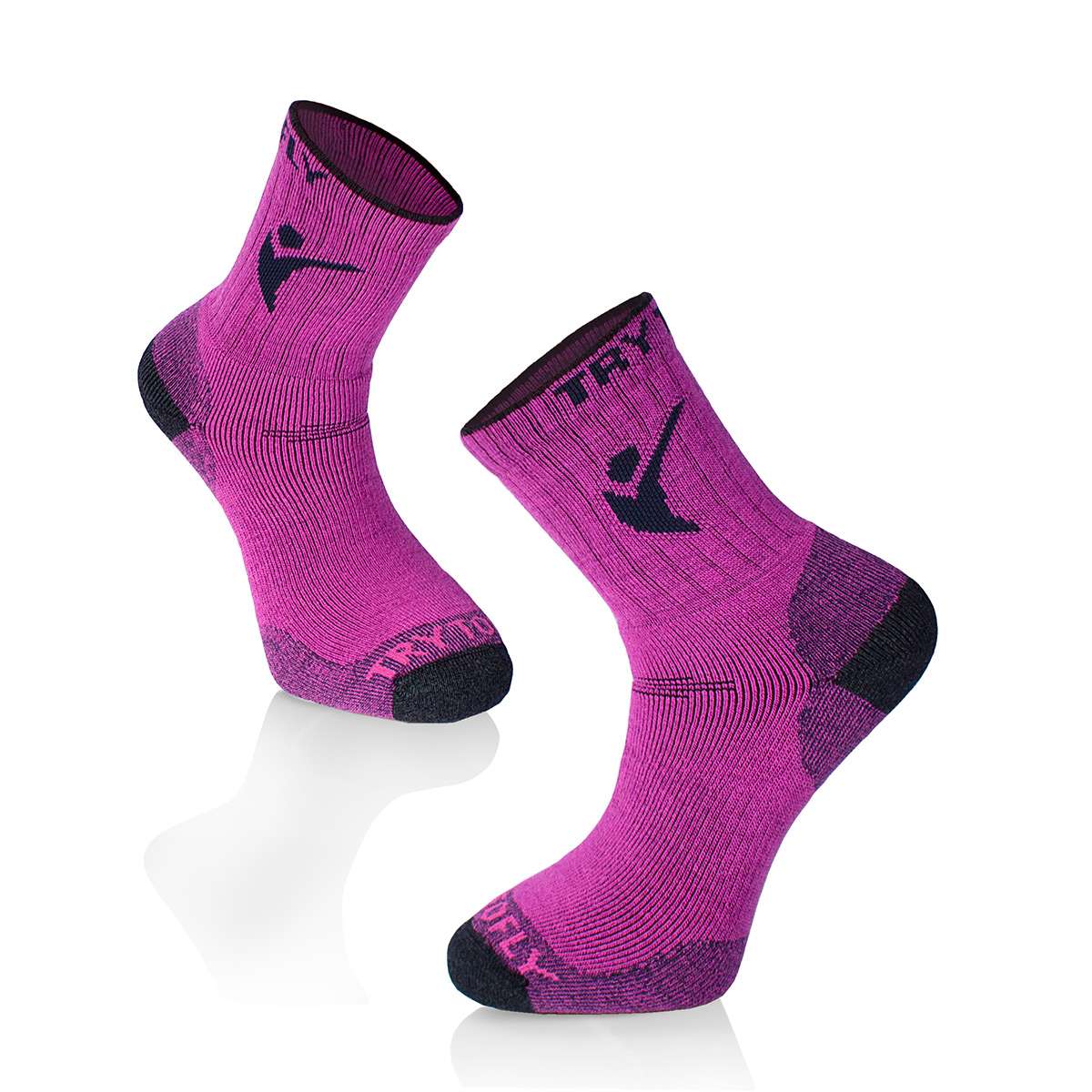 TRY TO FLY Hiking Socks sērijas zeķes ir radītas kalnu tūrismam un gariem pārgājieniem. Tās izgatavotas no augstvērtīgas merino vilnas, ko ražo Suedwolle (Vācija) — materiāla, kas izceļas ar izcilām siltumizolācijas un termoregulācijas īpašībām, nodrošinot siltumu ziemā un komfortu mainīgos laikapstākļos.