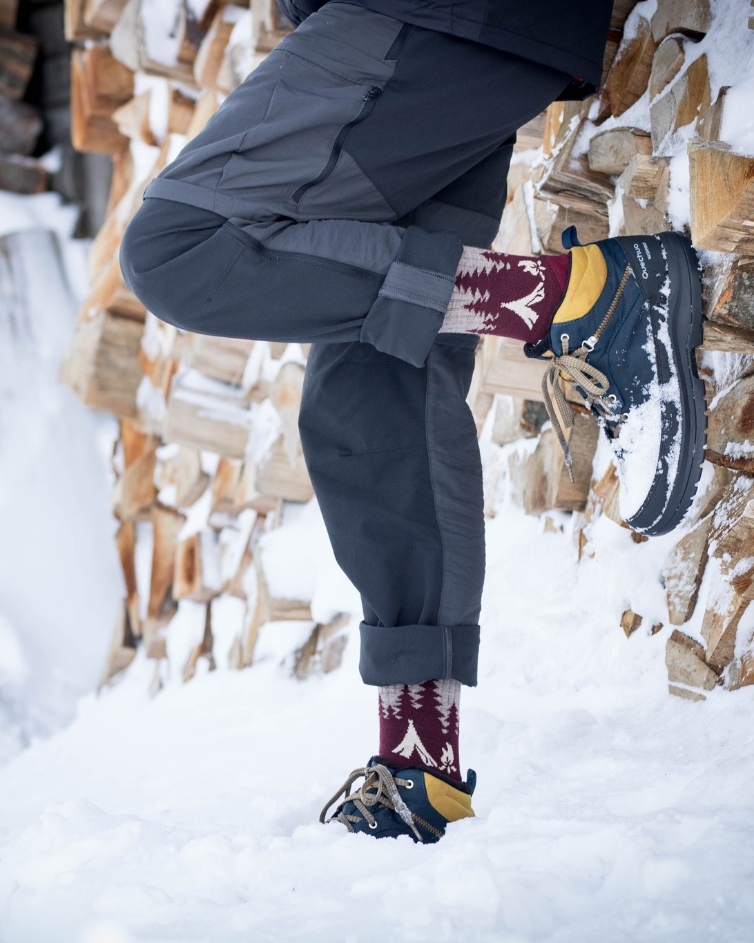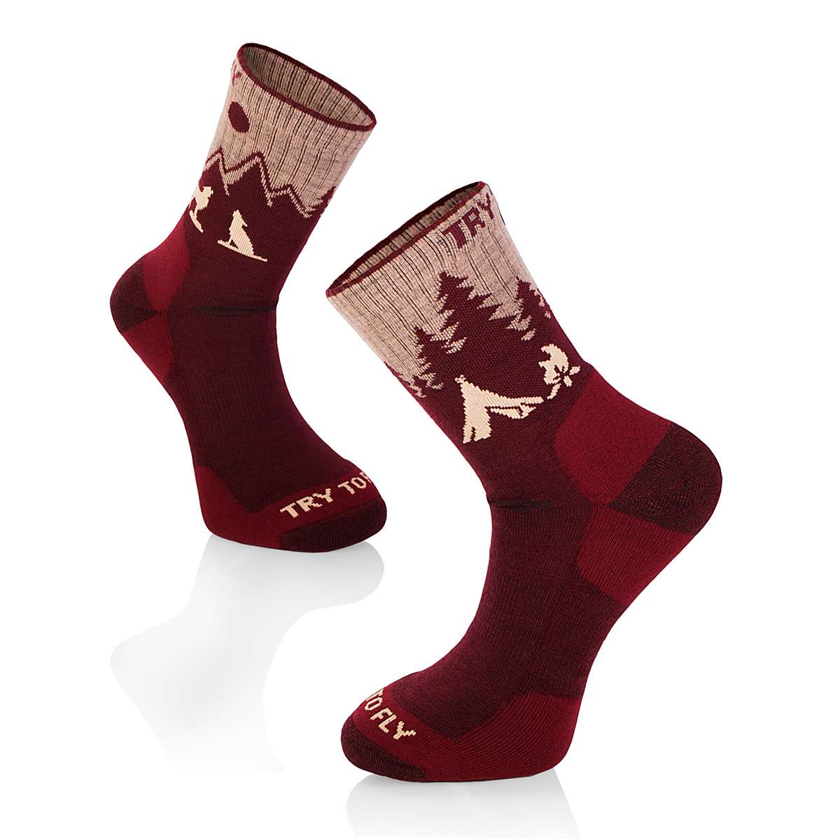 Merino vilnas pārgājienu zeķes ar vilka attēlu – bordo